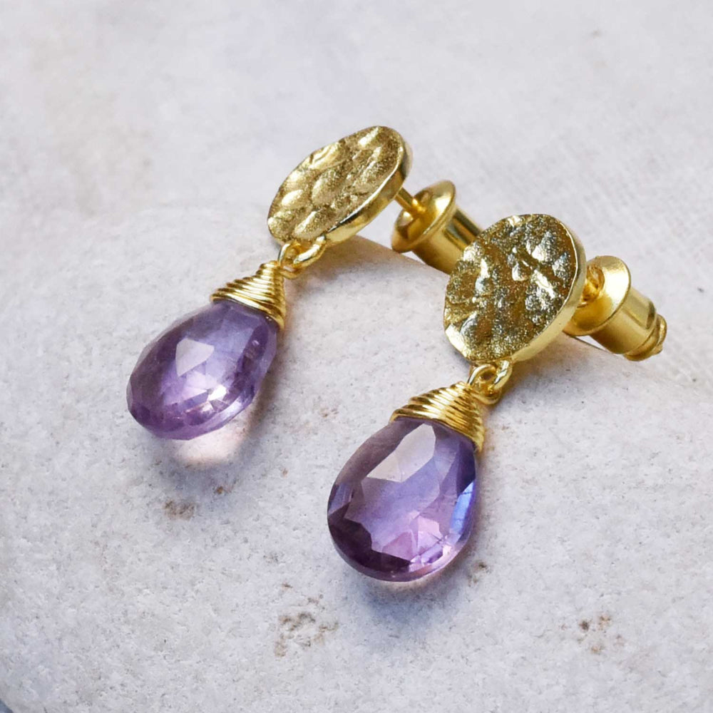 槌目(ハンマー加工)を施したトップのコイン型スタッドは、表面のテクスチャーが光を反射して有機的でニュアンスのある表情。金線で上部を丁寧に巻かれた天然石のファセットがきらめくドロップピアスは、ファッションをぐっとひきあげてくれる AZUNI LONDONのシグニチャーアイテムです。