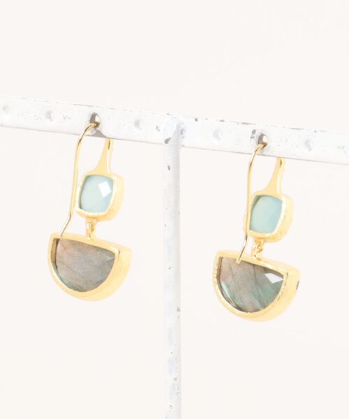 つぶつぶした装飾が施されたフックとクッションカットの天然石から、ハーフムーン型の天然石がゆれる印象的なデザイン。